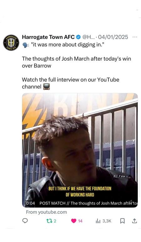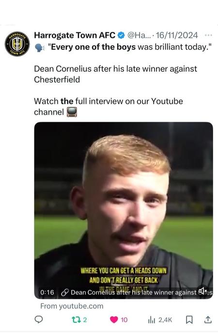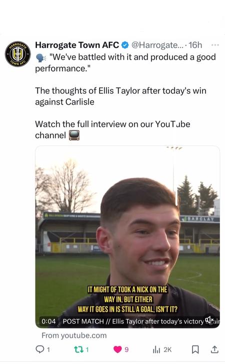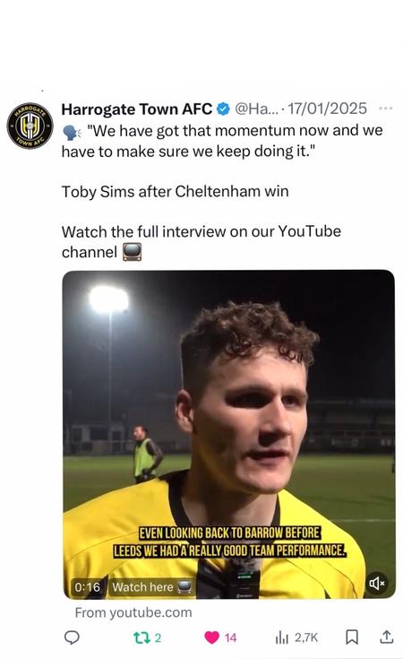 As part of my role within the Media Team at Harrogate Town AFC, I conduct post-match interviews with players. These interviews are then shared on the club’s official social media channels, including X, YouTube, Instagram, Facebook, and WhatsApp.